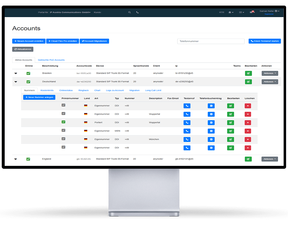 Aktuell betreiben wir eines der modernsten und leistungsstärksten IP-Kommunikationsnetze mit intelligentem Management für unterschiedliche IP Services, höchster Sprachqualität, Sicherheit und Verfügbarkeit. Damit bieten wir in über 60 Ländern weltweit ein umfangreiches Leistungsangebot wie internationales Rufnummern-Management, individuelle Servicekonzepte und eine eigens entwickelte Carrier Plattform für professionelles Monitoring, Fraud Management, Abrechnung, Buchung und Portierung von Rufnummern und vielen weiteren Features.